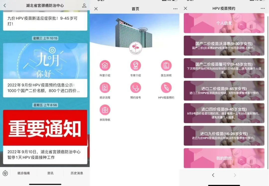 4、预约方式:微信关注湖北省宫颈癌防治中心公众号,以抢号的形式预约,每周一(9月12日、9月19日、9月26日)上午10点整开放预约通道,每周 750个名额,合计2250个 。预约成功后,可在“我的预约”查看预约记录。请在15天内挂妇科Ⅱ预防接种号到湖北省宫颈癌防治中心接种。