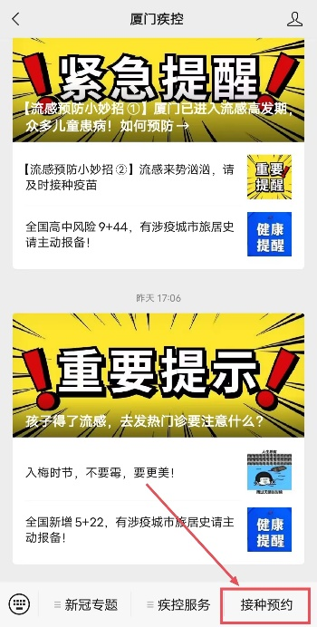 第一步:关注“厦门疾控“微信公众号,选择”接种预约“(已经关注过且接种过疫苗的请略过);