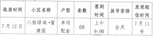 受南宁城市建设投资集团有限责任公司委托,由我司负责八桂绿城·富康园项目的运维管理工作。根据《公共租赁住房运行管理标准》、《南宁市公共租赁住房保障办法》(南宁市政府令第7号)《八桂绿城·富康园3号楼公共租赁住房分配管理方案》和《关于2022年第一批次八桂绿城·富康园3号楼公共租赁住房报名选房分配通告》等有关规定,我司定于2022年7月12日开展2022年第二批次八桂绿城·富康园3号楼公共租赁住房选房分配工作,现将选房分配事项通告如下: