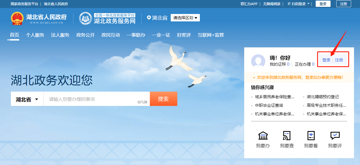 登录“湖北政务服务网”,进入页面,选择【登录】(未注册用户需先注册)。