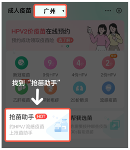 2、下载后,选择“广州”地区,点击 “成人疫苗” ,点击“抢苗助手”。