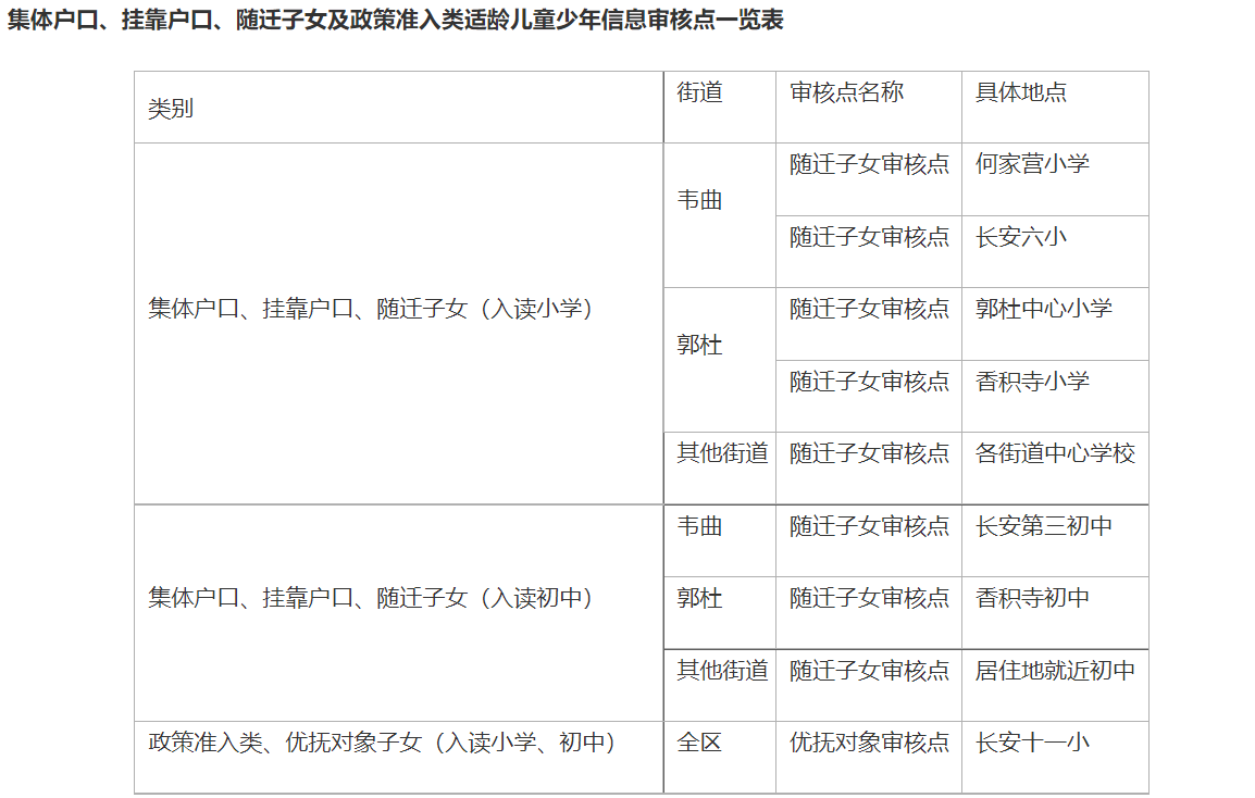 长安区户籍适龄儿童少年预约户籍地学区学校;非长安区户籍、符合入学政策规定的随迁子女,预约居住街道的随迁子女审核点;优抚对象子女预约优抚对象子女信息审核点。