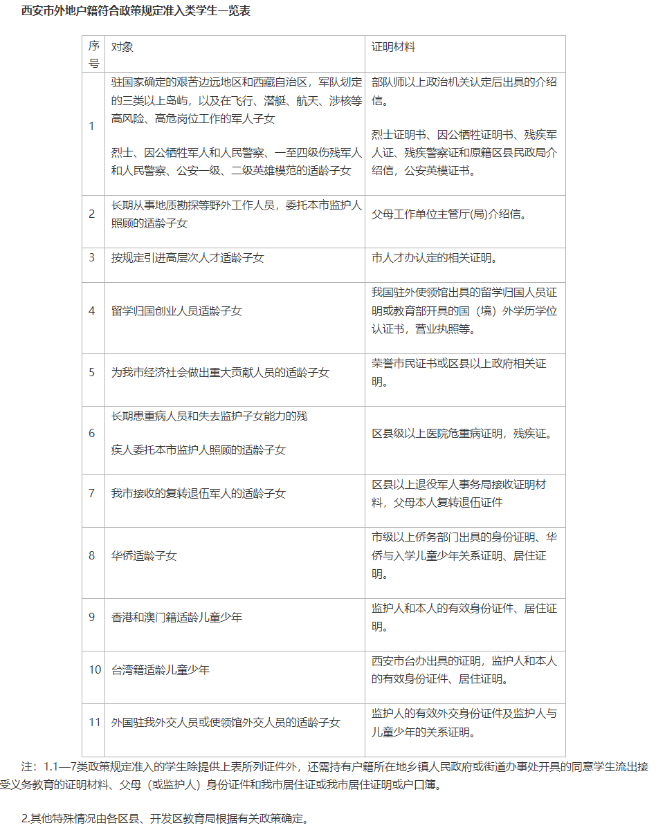 《西安市义务教育招生入学信息审核登记表》一式两份及《西安市外地户籍符合政策规定准入类学生一览表》要求提供的规定材料。入初中的,还需提供小学毕业生相关证明材料(毕业生登记表、或综合素质评价手册、或学籍信息表)。