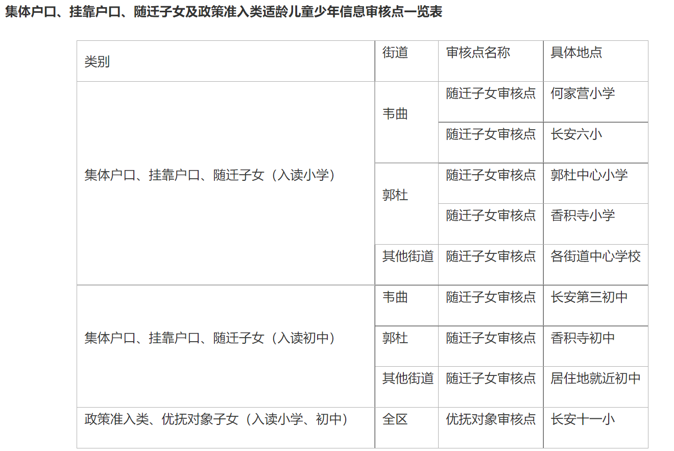 适龄儿童少年入学登记前网上预约信息审核点和审核时段。长安区户籍适龄儿童少年预约户籍地学区学校;非长安区户籍、符合入学政策规定的随迁子女,预约居住街道的随迁子女审核点;优抚对象子女预约优抚对象子女信息审核点。