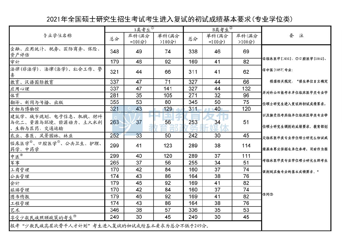 2022年全国硕士研究生招生考试考生进入复试的初试成绩基本要求(专业学位类):