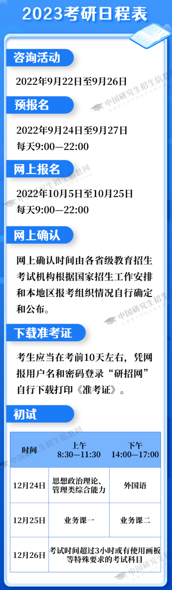2023年全国硕士研究生招生考试初试定于2022年12月24日至25日,考试时间超过3小时或有使用画板等特殊要求的少数考试科目安排在12月26日。