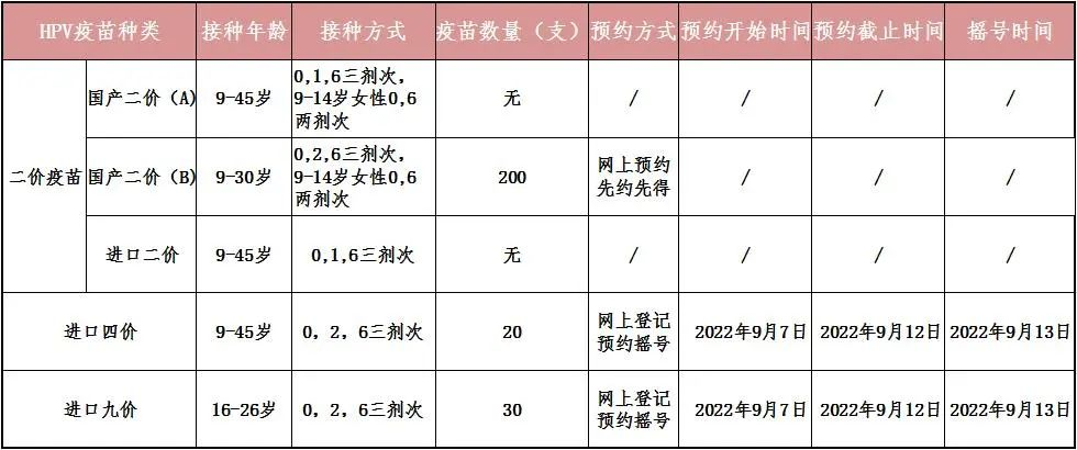 本月四价HPV疫苗20个名额,九价HPV疫苗30个名额,采用预约摇号登记。国产二价HPV疫苗本月200支。进口二价HPV疫苗缺货,只为接种第二针、第三针的女士服务(限第一针在我院接种的人群)。