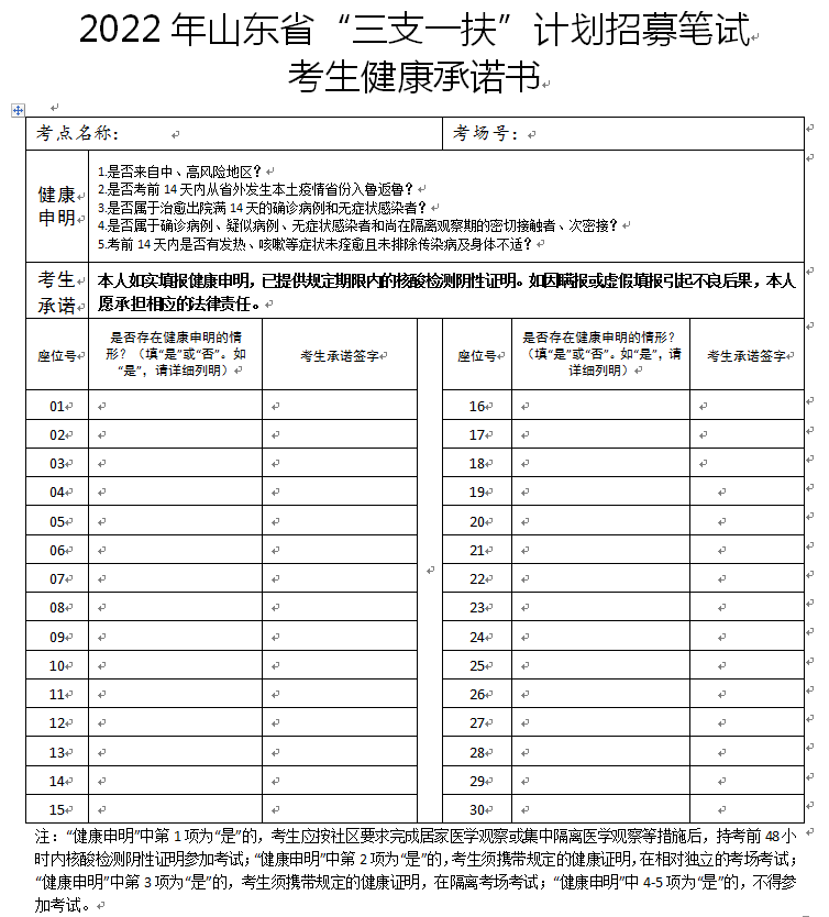 附件:2022年山东省“三支一扶”计划招募笔试考生健康承诺书