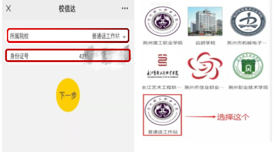 (1)在所属院校栏选择“普通话测试站”;(2)在身份证号码栏输入本人身份证号码;(3)点击“下一步”;