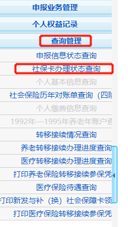第六步:进入北京市社会保险网上服务平台后,点击左侧菜单栏的【查询管理】-【社保卡办理状态查询】即可查询社保卡办理的状态。