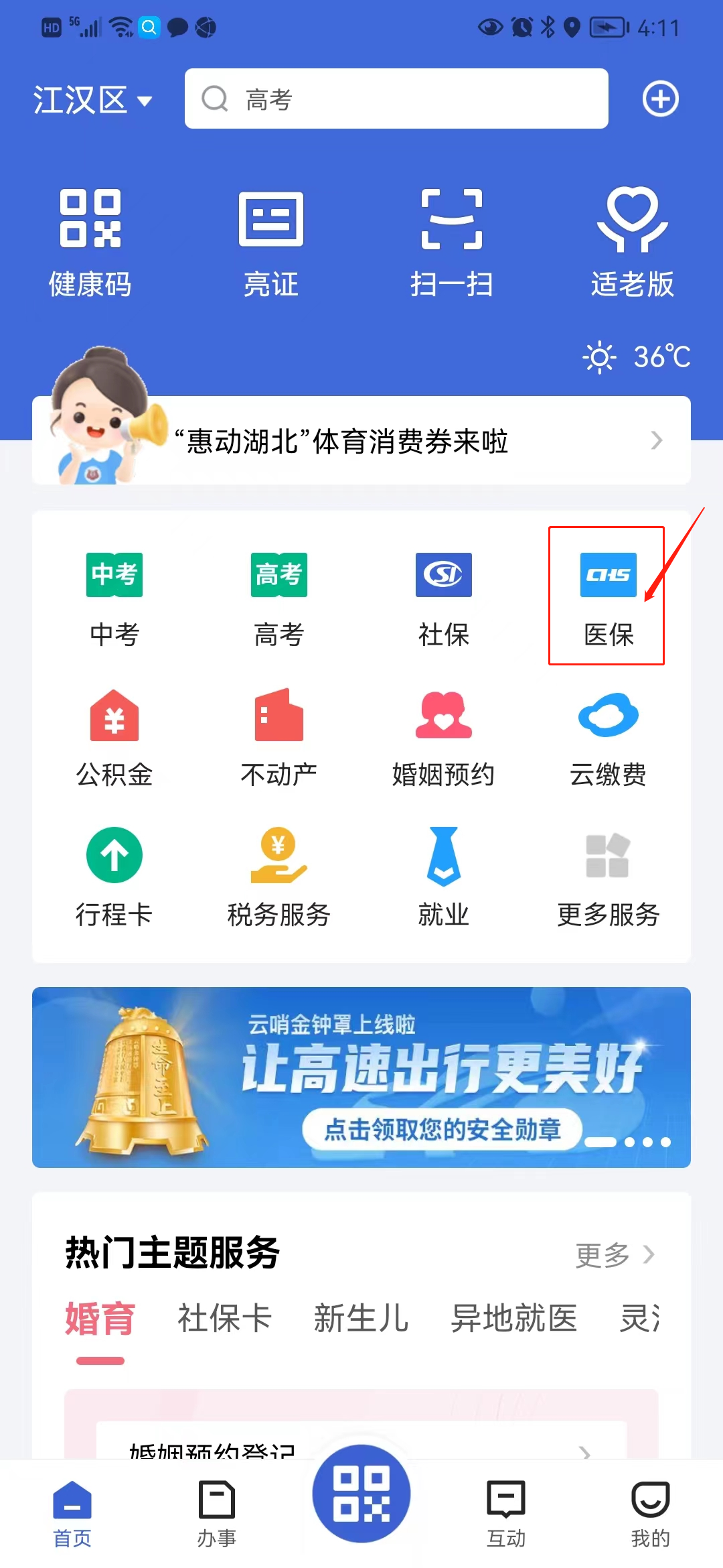 进入首页页面,选择【医保服务专区】,进入“湖北省医保网办服务专区”页面后,往下滑动至“便民服务”专栏,选择【个人权益】,点击【基本医保参保缴费凭证】;