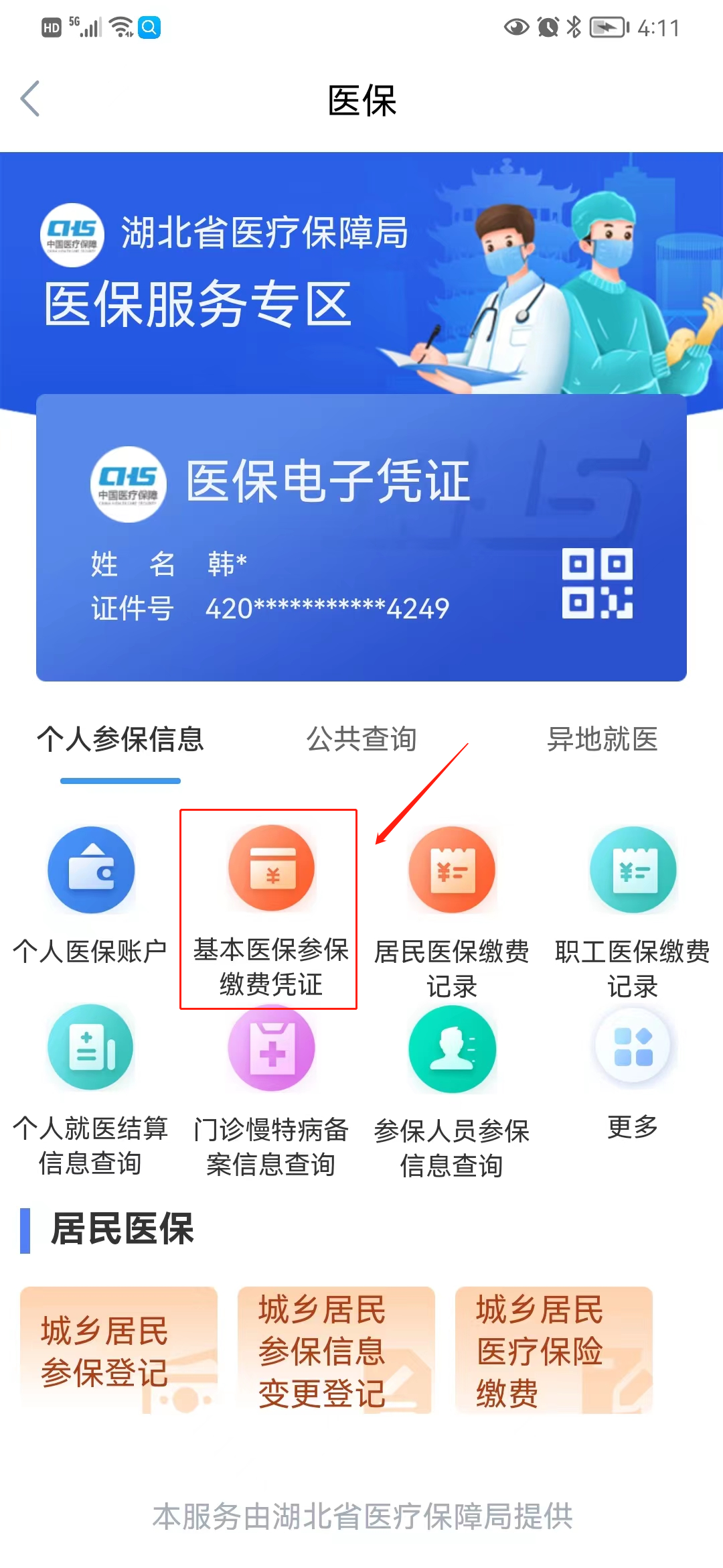 进入首页页面,选择【医保】,进入“医保”页面 ,在【个人参保信息】栏目下点击【基本医保参保缴费凭证】;