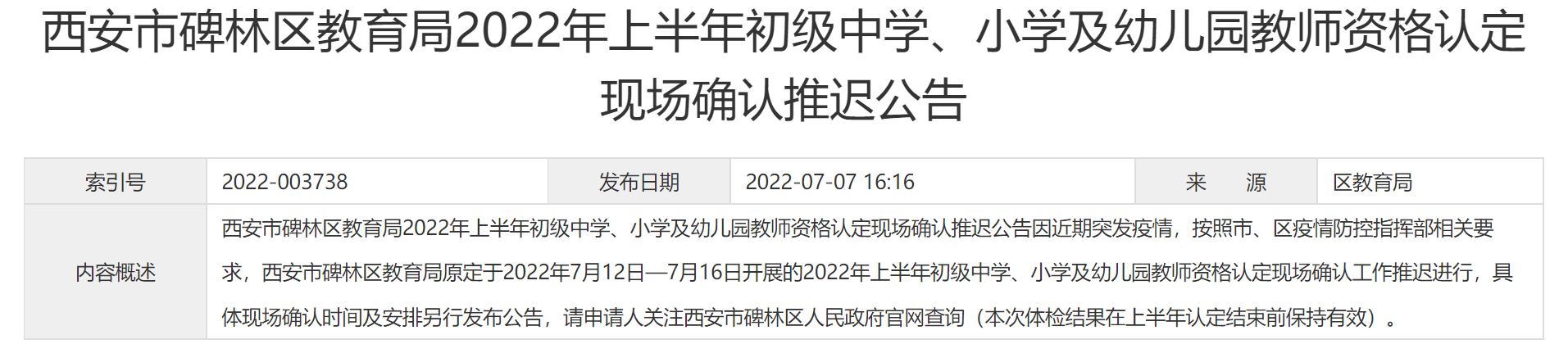 因近期突发疫情,按照市、区疫情防控指挥部相关要求,西安市碑林区教育局原定于2022年7月12日—7月16日开展的2022年上半年初级中学、小学及幼儿园教师资格认定现场确认工作推迟进行,具体现场确认时间及安排另行发布公告,请申请人关注西安市碑林区人民政府官网查询(本次体检结果在上半年认定结束前保持有效)。