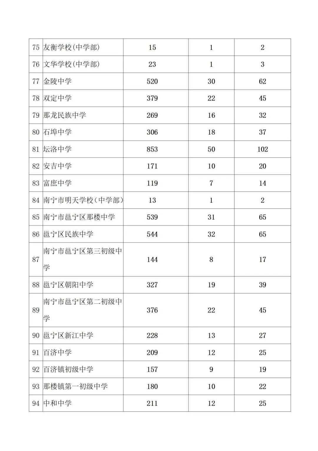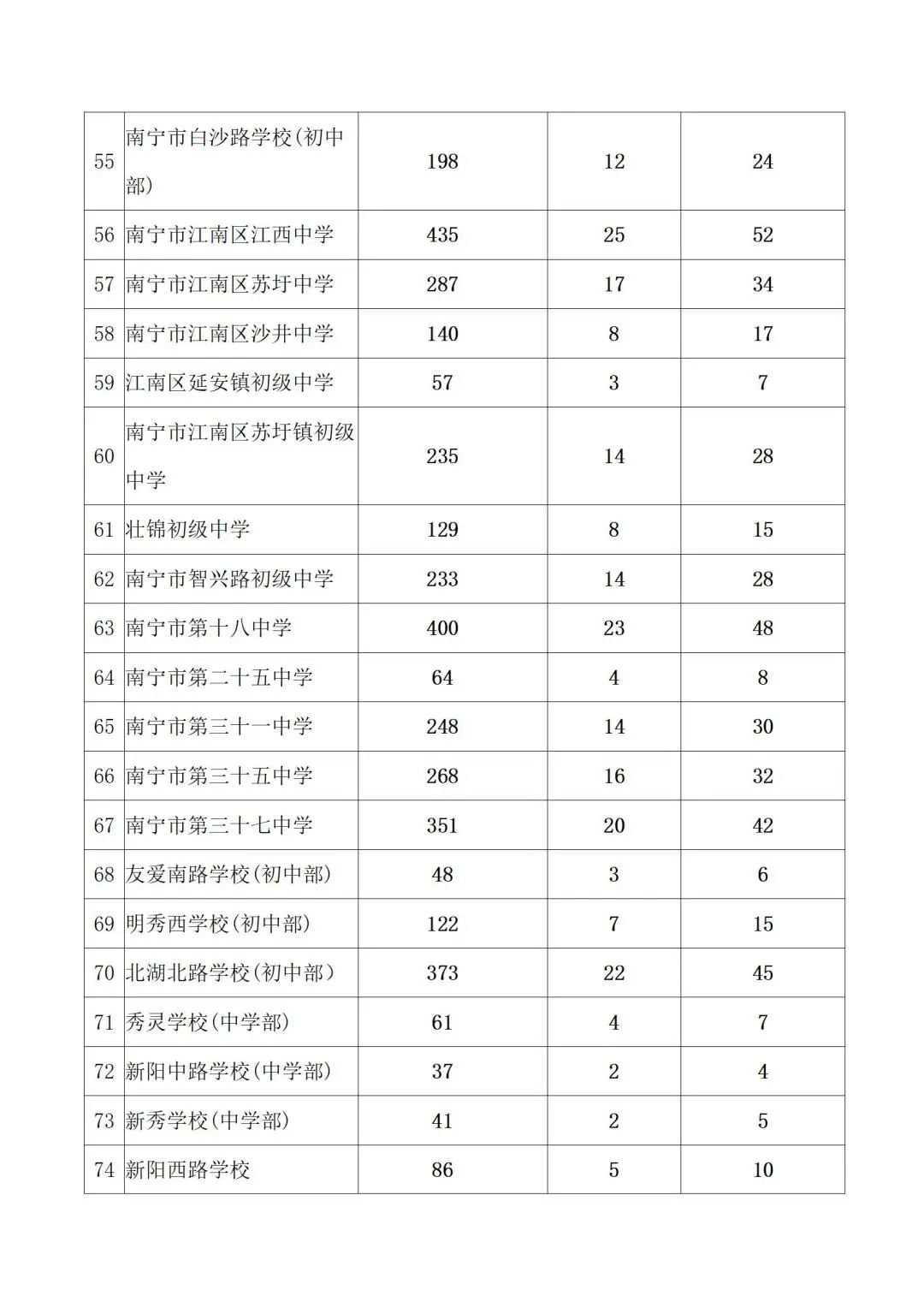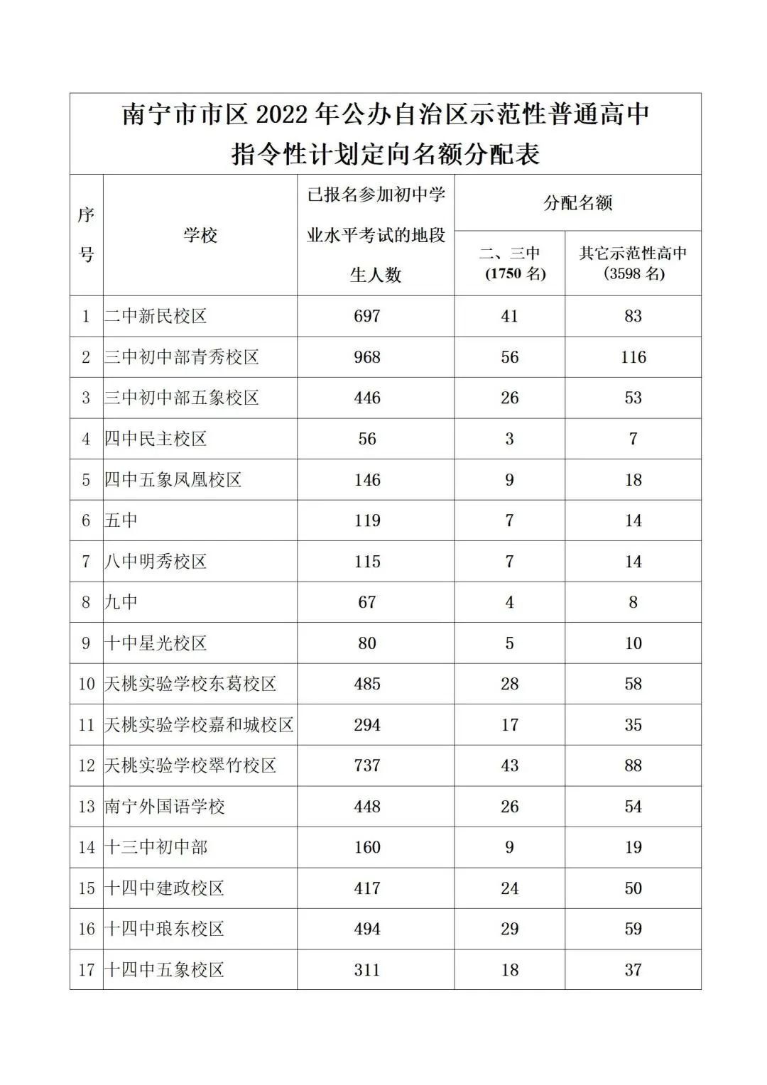 南宁市区2022年公办自治区示范性普通高中定向名额分配表