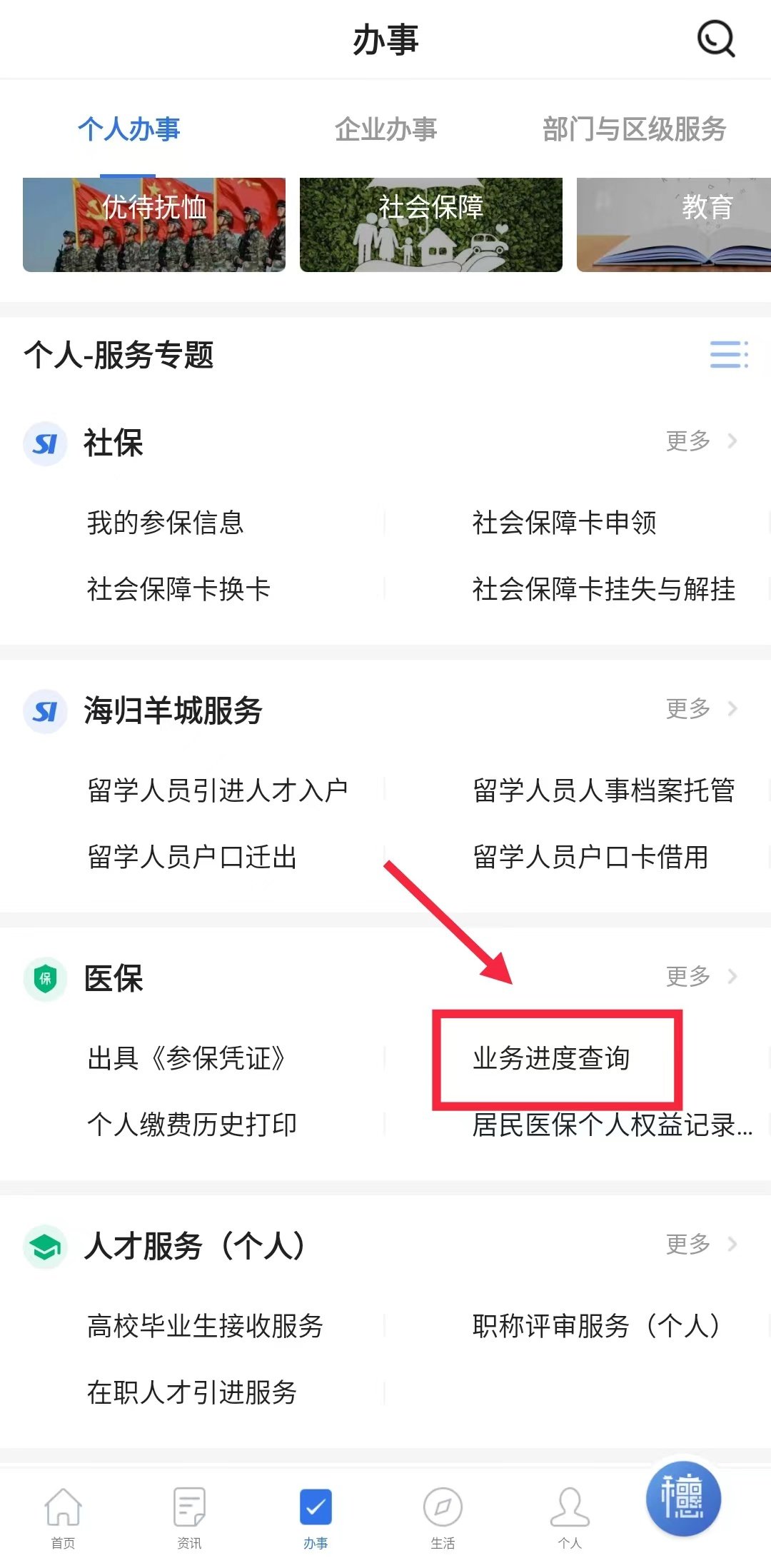 第二步:在“办事”找到“医保”--“业务进度查询”,如下图所示:
