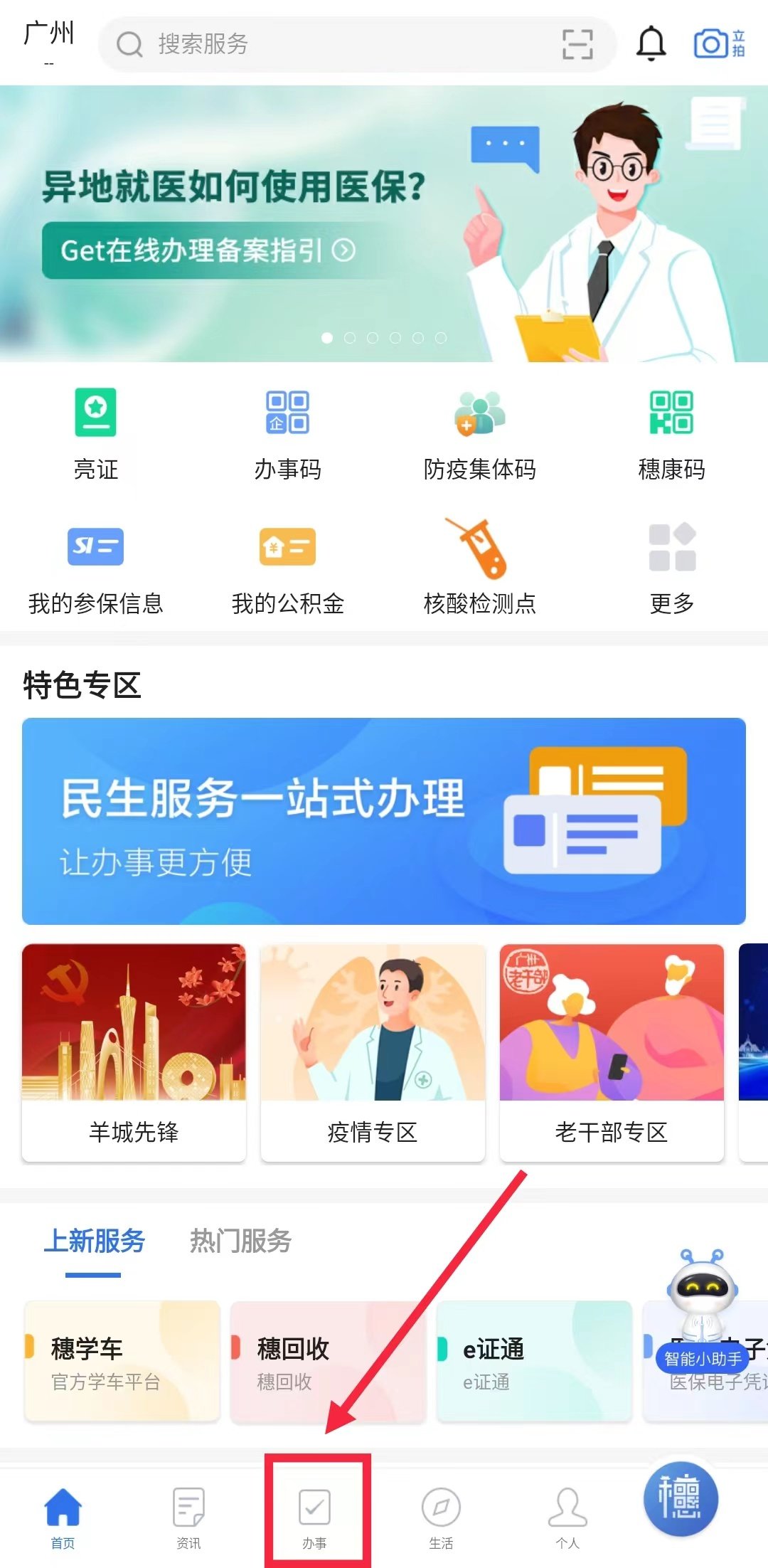 第一步:实名认证登录“穗好办APP”,找到“办事”,如下图所示: