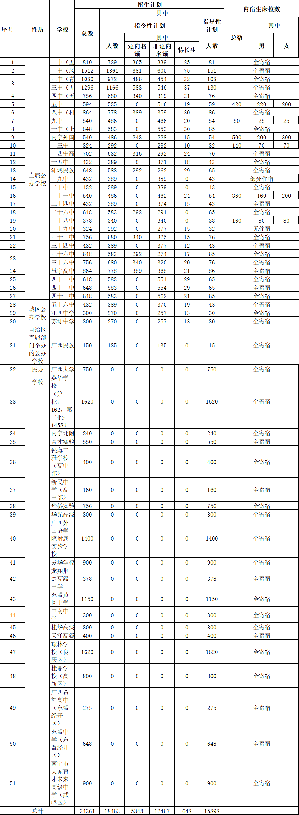 其中,南宁二中计划招生1512人,南宁三中(含青山校区和五象校区)计划招生2376人。两所高中共计划招生3888人,招生人数与去年持平。南宁二中、三中指令性计划为3499人,除二中、三中外的其他公办示范性普通高中指令性计划为7192人。