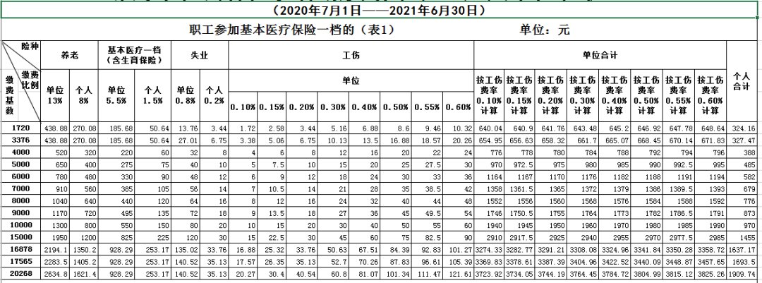 【说明:①1720元为失业保险、工伤保险缴费基数下限(即本市最低工资标准);3376元为职工基本养老保险、职工基本医疗保险(含生育保险)缴费基数下限(即广东省第二类片区(珠海市)2018年全口径从业人员月平均工资5626元的60%)。20268元为职工基本养老保险缴费基数上限(即广东省2019年全口径从业人员月平均工资6756元的3倍);16878元为职工基本医疗保险(含生育保险)缴费基数上限(即广东省第二类片区(珠海市)2018年全口径从业人员月平均工资5626元的3倍),17565元为失业保险缴费基数上限(即广东省第二类片区(珠海市)2019年全口径从业人员月平均工资5855元的3倍)。②表中的工伤保险费率为珠海市执行的行业基准费率,2021年5月之前,应国家要求执行阶段性下调费率政策,具体请参阅相关文件。③由于表格空间所限,部分数据进行了四舍五入。④咨询电话12345、12333。】