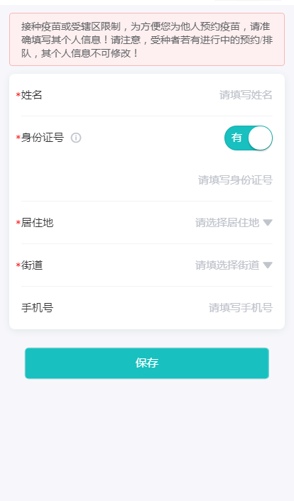 3、如果为家人排队预约,则需点击“受种者管理”,添加家庭成员真实有效身份信息;