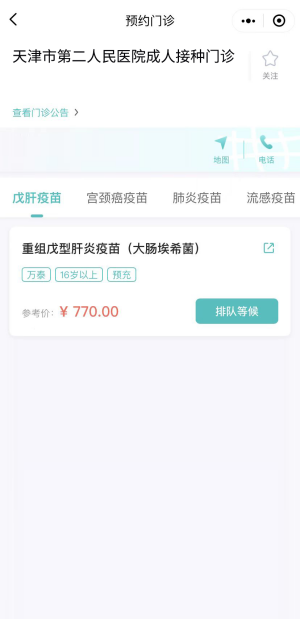 天津第二人民医院成人预防接种预约流程(线上预约)