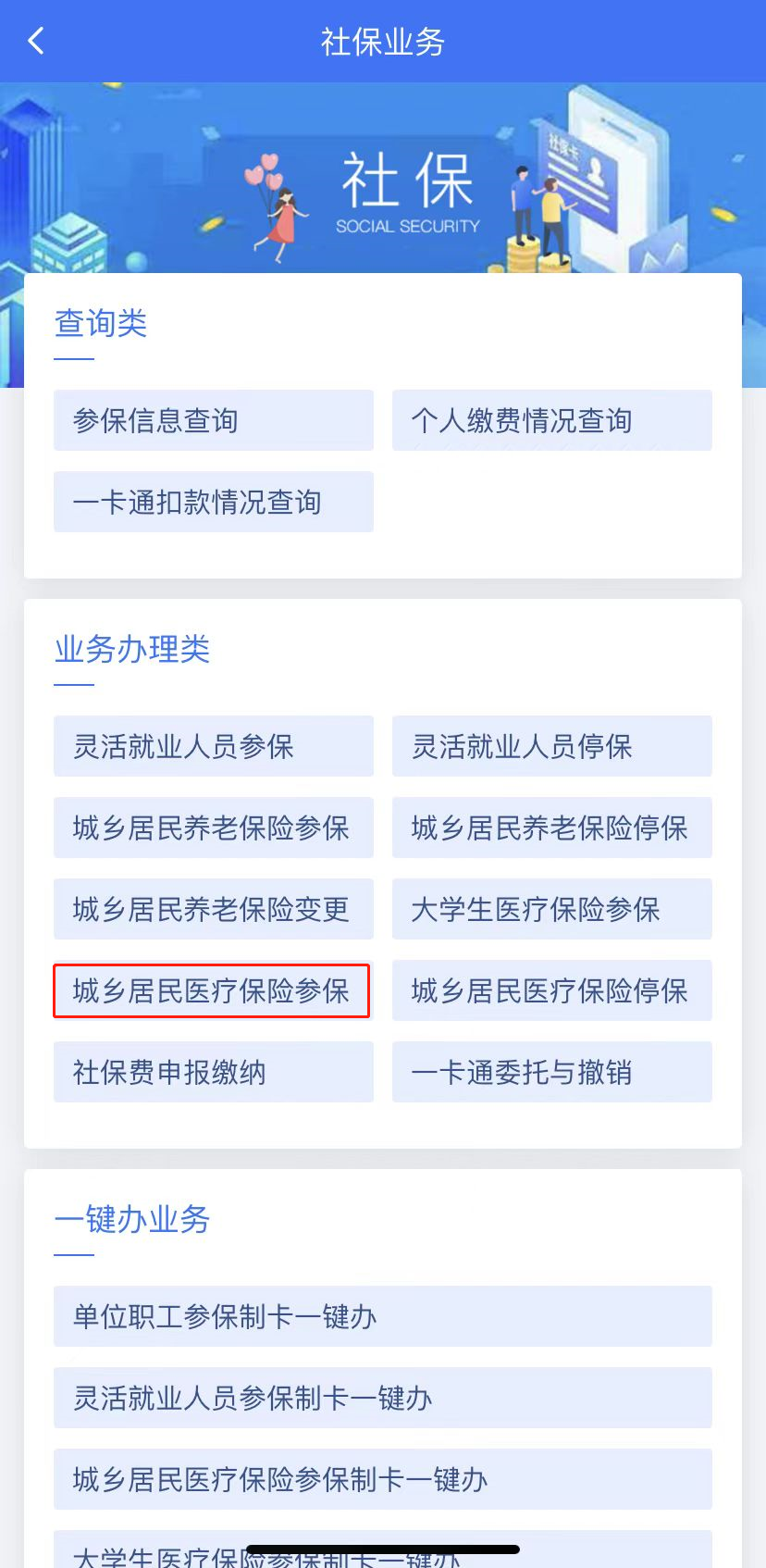 (1)登录首页后,选择“办税”-“社保业务”,点击“城乡居民医疗保险参保”;