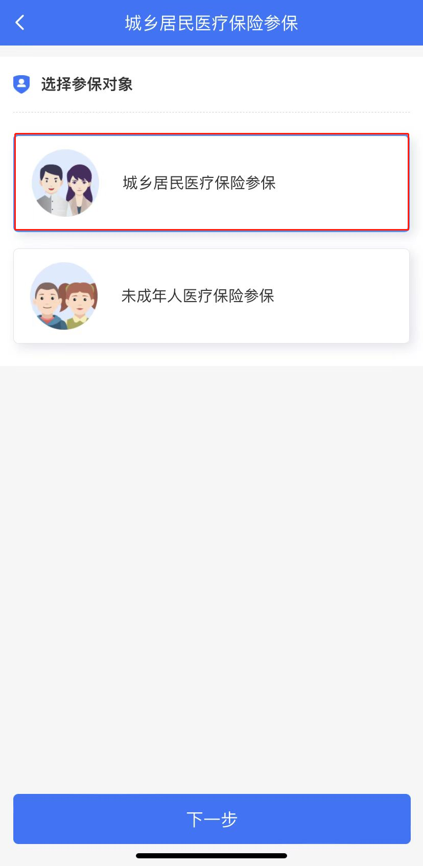 (2)选择参保对象“城乡居民医疗保险参保”,点击下一步;