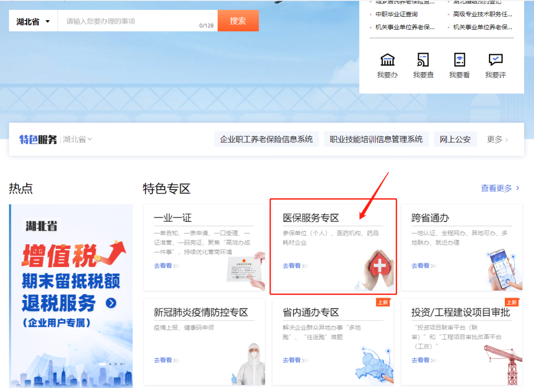 进入首页页面,选择【医保服务专区】,进入“湖北省医保网办服务专区”页面后,往下滑动至“便民服务”专栏,选择【个人权益】,点击【基本医保参保缴费凭证】;