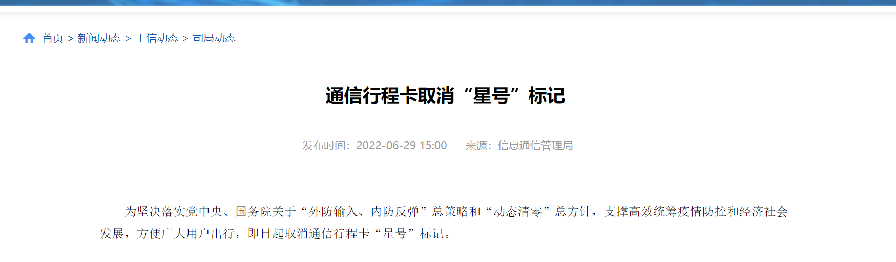 温馨提示:2022年工信部发布通知,方便广大用户出行,即日起取消通信行程卡“星号”标记。