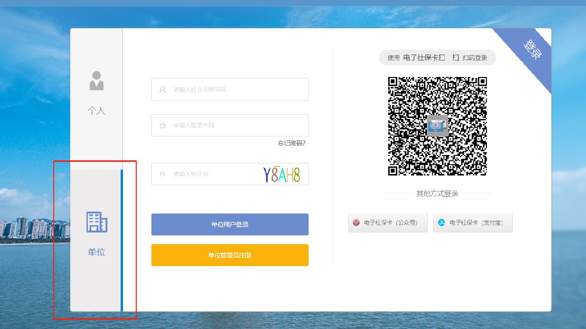 5.选择单位,输入社会保障号码、登录密码、验证码即可登录。