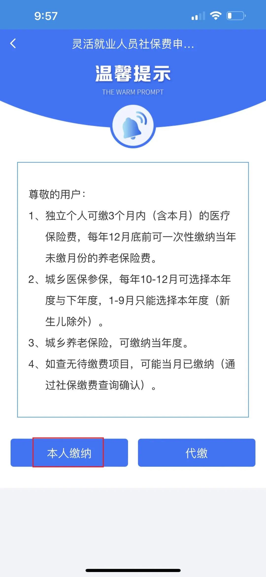 点击本人缴纳;