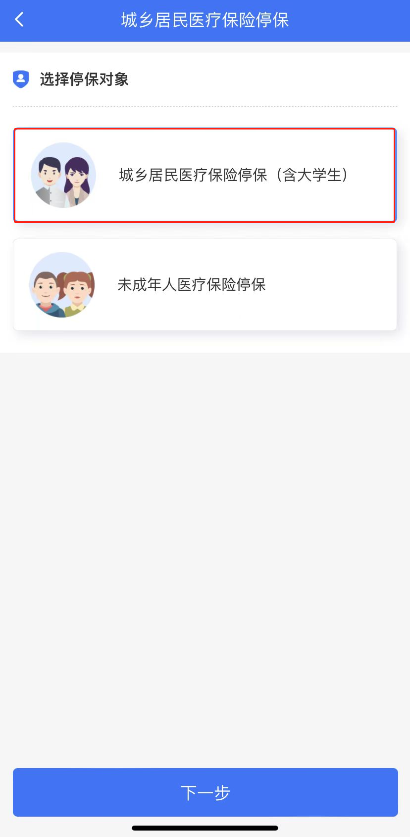 (2)选择停保对象“城乡居民医疗保险停保(含大学生)”,点击下一步;