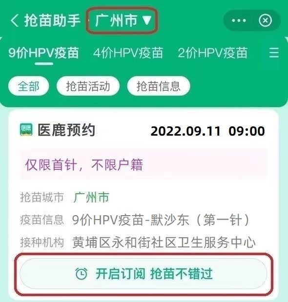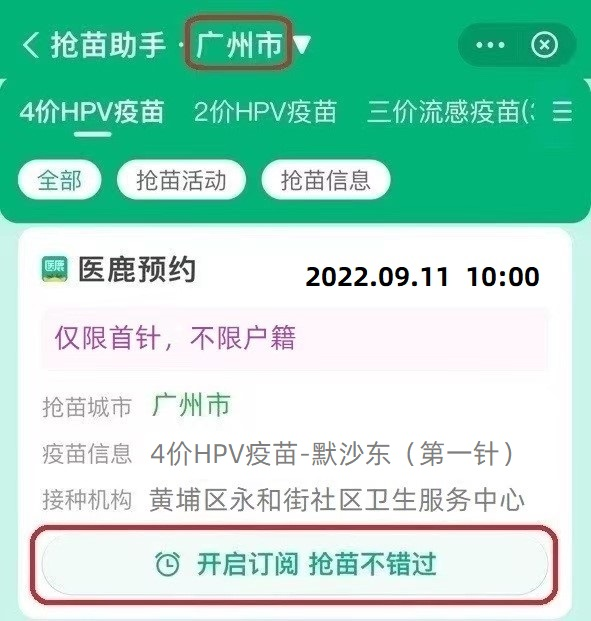 9月11日黄埔区永和街四价九价hpv疫苗首针预约接种通知