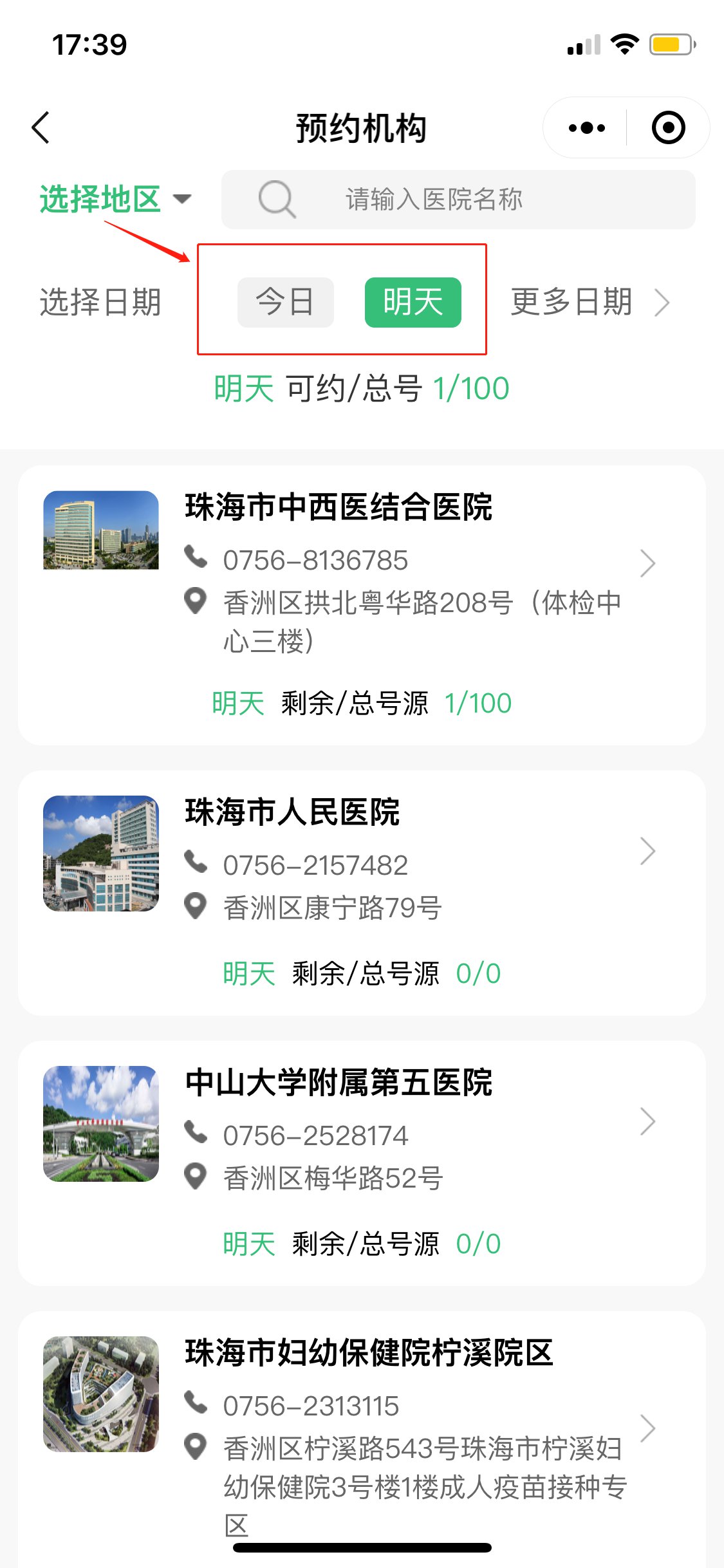 步骤2:查看今日、明天放号数量,然后选择预约机构;