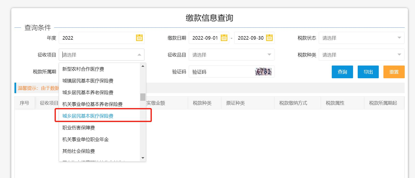 3、第三步:根据系统提示选择征收项目为“城乡居民基本医疗保险费”,并选择年度、征收品目等,输入验证码,点击“查询”即可。
