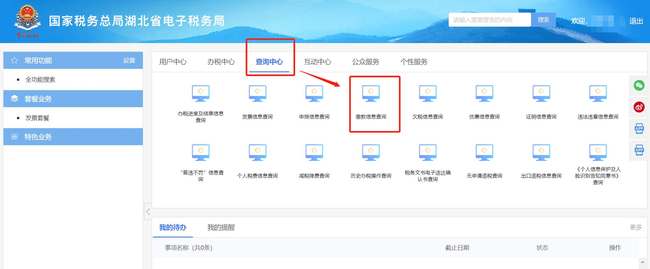 2、第二步:依次点击“首页”-“查询中心”-“缴款信息查询”;