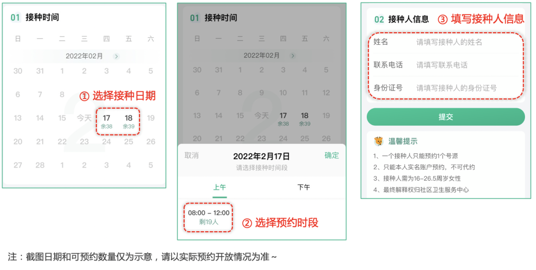 本次预约需在预约通道开放后尽快勾选疫苗接种时间,填写姓名、身份证号码、手机号码,系统会在线核实用户是否符合疫苗接种条件,是否实名账户本人,只有符合条件的用户才可以进行预约。确认提交,操作成功后系统会自动提示本次预约成功,并会收到系统发送的短信确认码。