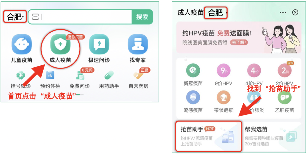 02选择“合肥”地区,点击首页“成人疫苗” ,进入页面后再点击"抢苗助手"。
