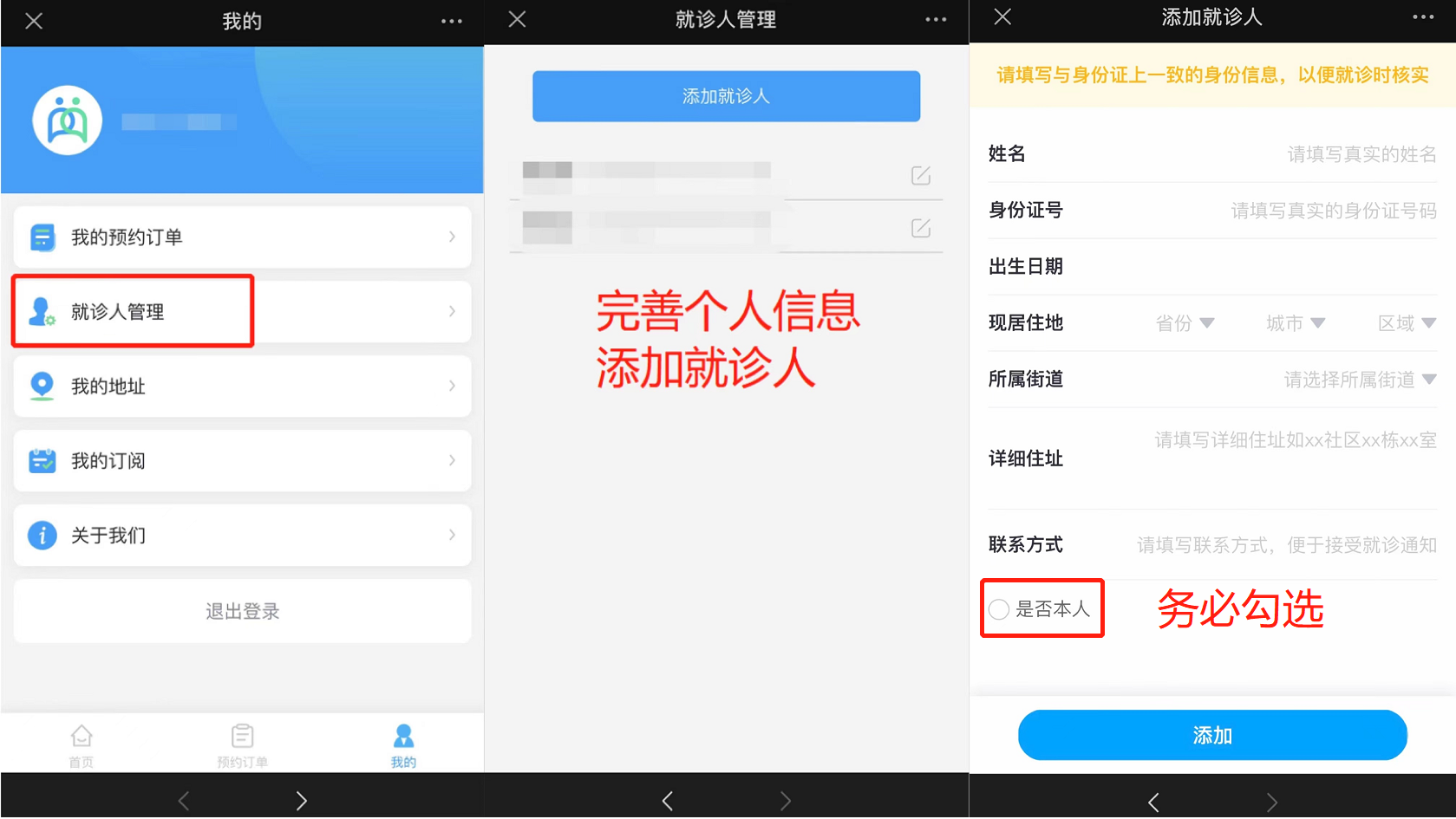 登录进入后,点击“我的→就诊人管理”,点击“添加就诊人”。完善个人信息后,点击“添加”即可完成。