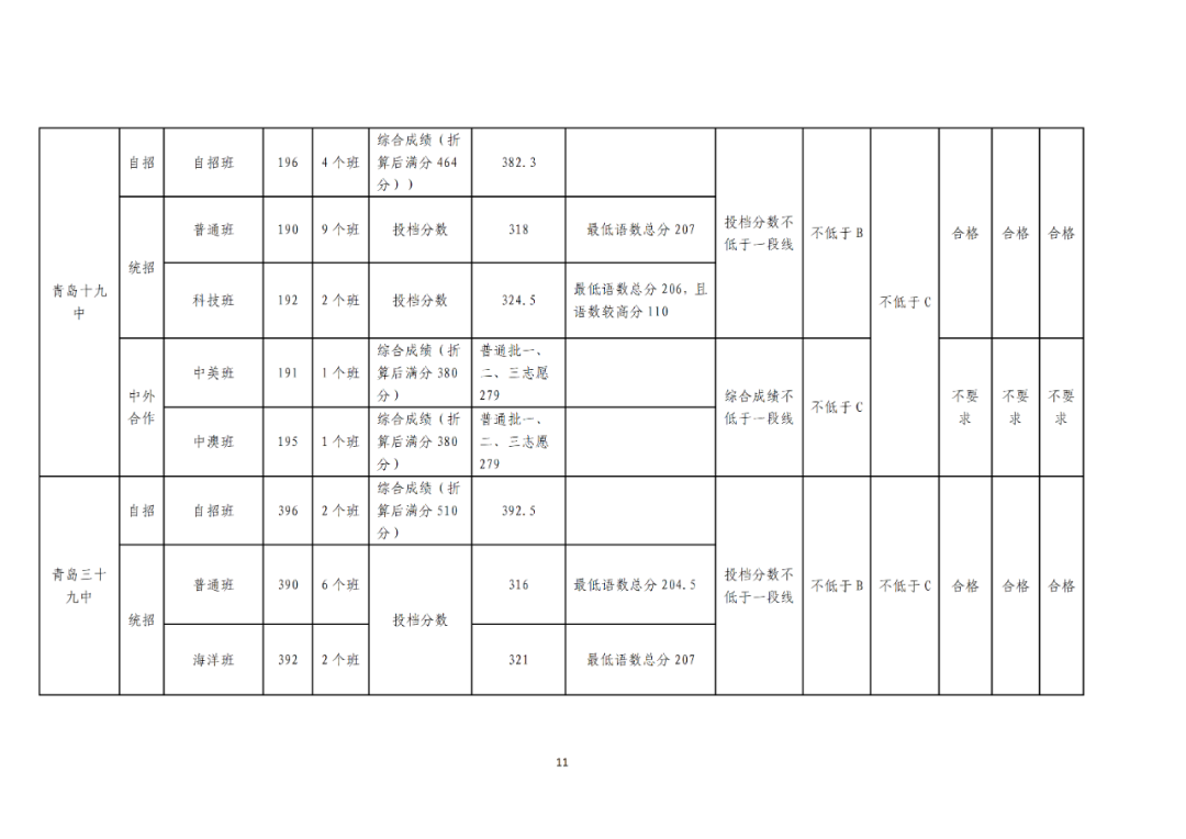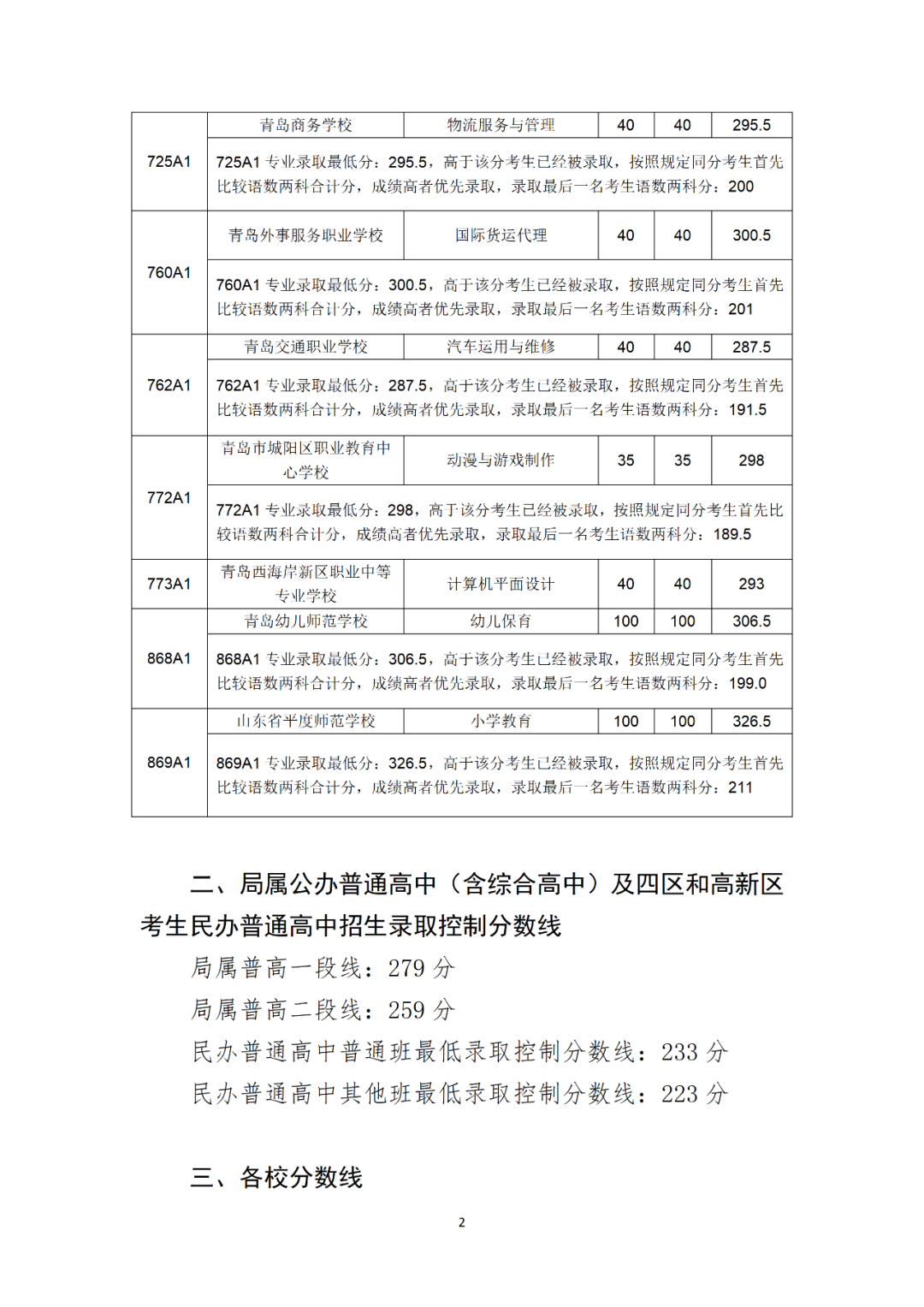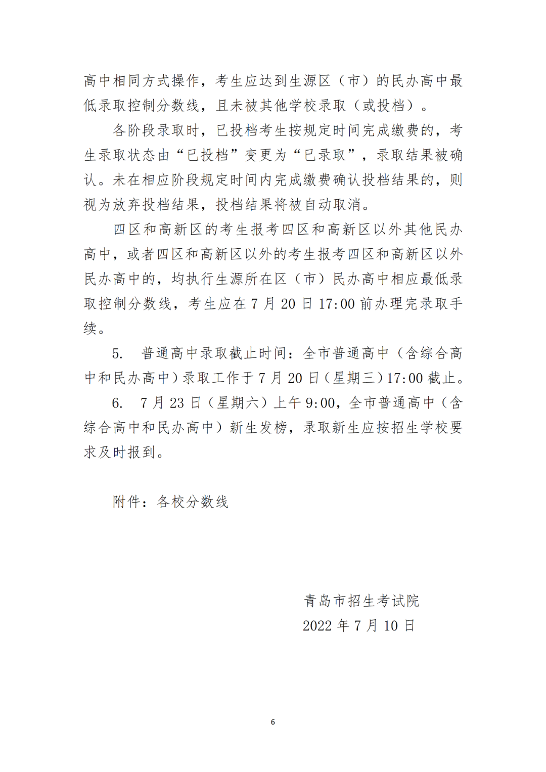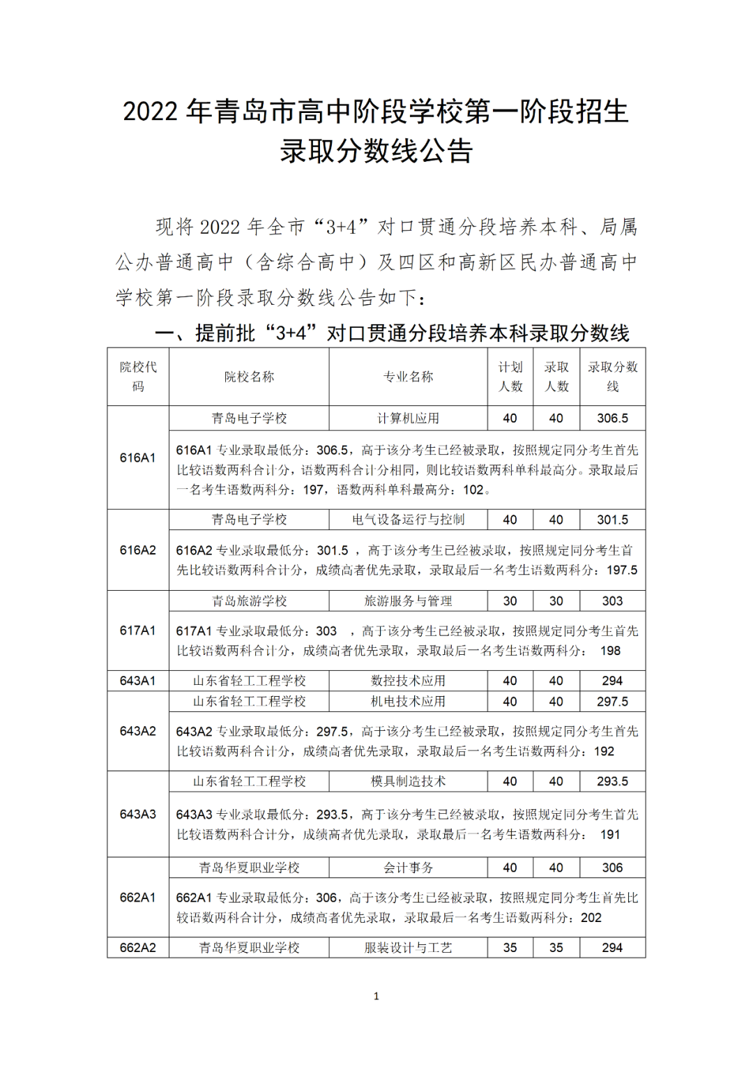 2022年青岛市高中阶段学校第一阶段招生录取分数线公告