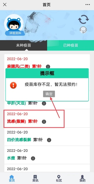第四步:注册登录成功后,就进入到疫苗界面了。在“未种疫苗—非免疫规划疫苗栏”找到流感疫苗(流感裂解指的就是三价灭活流感疫苗)红色就表示目前接种门诊库存不足,无法预约;绿色表示目前有苗可以预约。已在厦门疾控微信公众号上注册过的小伙伴可跳过前三步,直接进入疫苗界面。