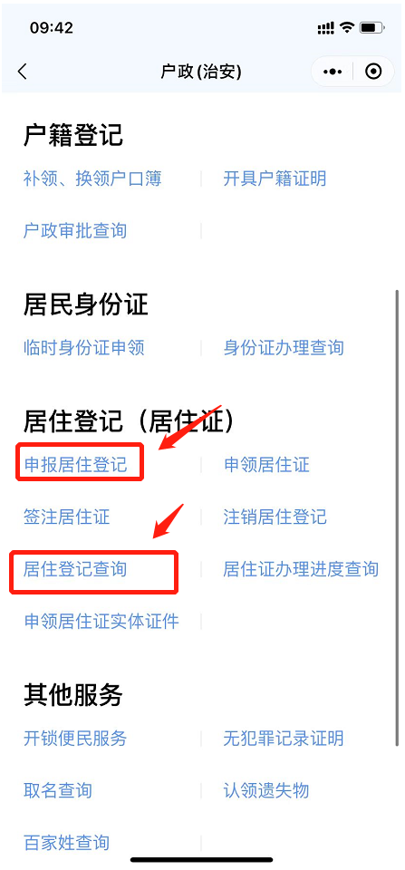 第二步:以小程序为例,“主页”-“热门服务”第二页的位置,进入“户政(治安)”,选择“申报居住登记”。申报居住登记成功后,可在此页面下方“居住登记查询”查看个人登记情况。