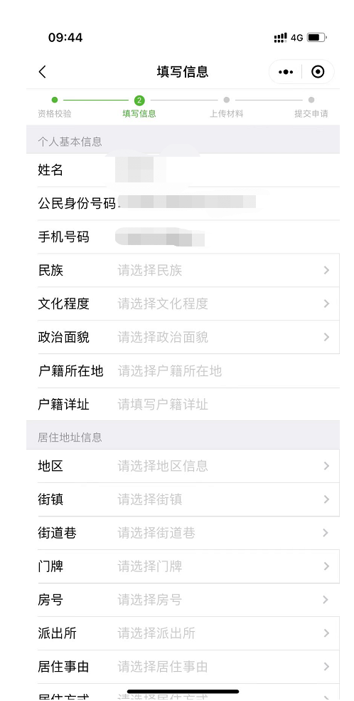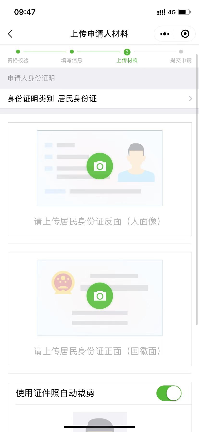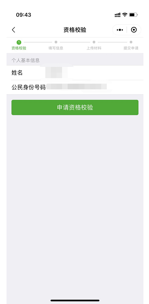 第四步:根据页面提示,按步骤进行:“资格校验”-“填写信息”-“上传材料”-“提交申请”
