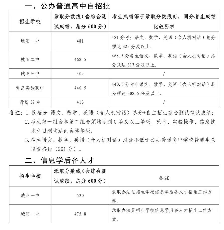 根据青岛市城阳区教育和体育局《关于做好2022年初中学业水平考试与高中学校招生工作的通知》和《关于印发城阳一中等五所学校2022年自主招生工作方案的通知》要求,现将青岛市城阳区 2022年普通高中学校招生录取分数线公告如下: