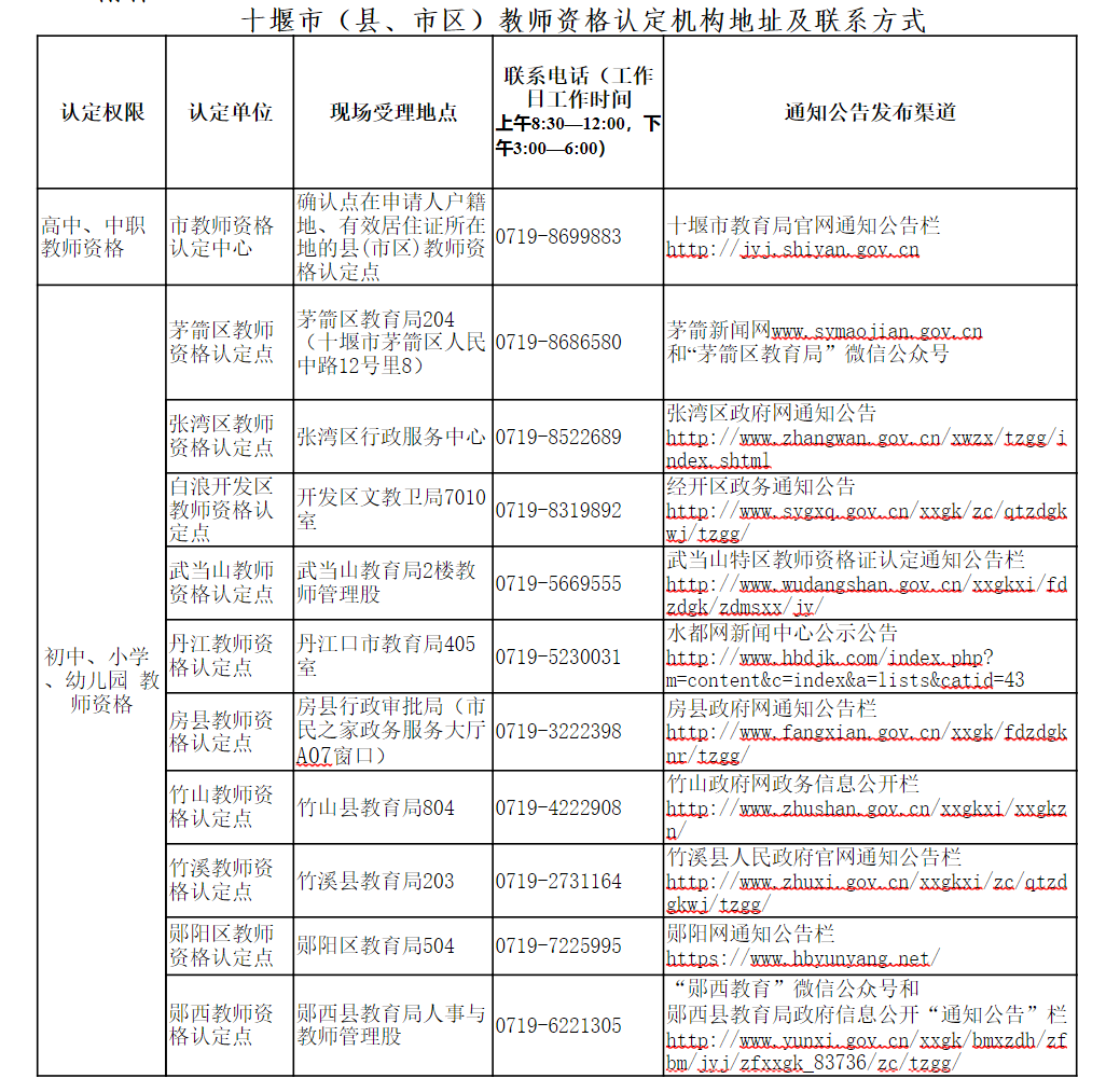 体检时间自本公告发布之日起有效。申请人须在十堰市人民医院、十堰市太和医院、国药东风总医院及各县市区教师资格认定机构规定医院进行体检,使用《湖北省教师资格申请人员体检表》,体检表需一张正反打印,所有体检项目必须完检,符合教师身体素质条件的要求,且鉴定结论为合格。省人民医院为疑义问题终检医院。(体检项目漏检、漏填,体检项目无医师签字、盖章不齐全、无医院明确结论、无体检日期均为无效体检结果)