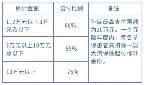 1、起付标准:符合大病保险保障范围的个人负担金额1.2万元。起付标准以上部分由大病保险分段按比例报销。