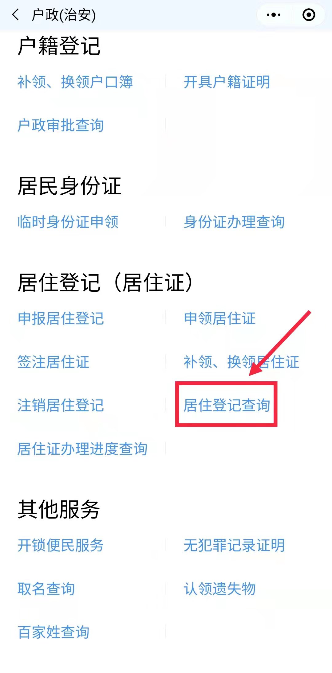 第三步:在【户政(治安)】版块中,找到【居住登记(居住证)】--【居住登记查询】,如下图所示:
