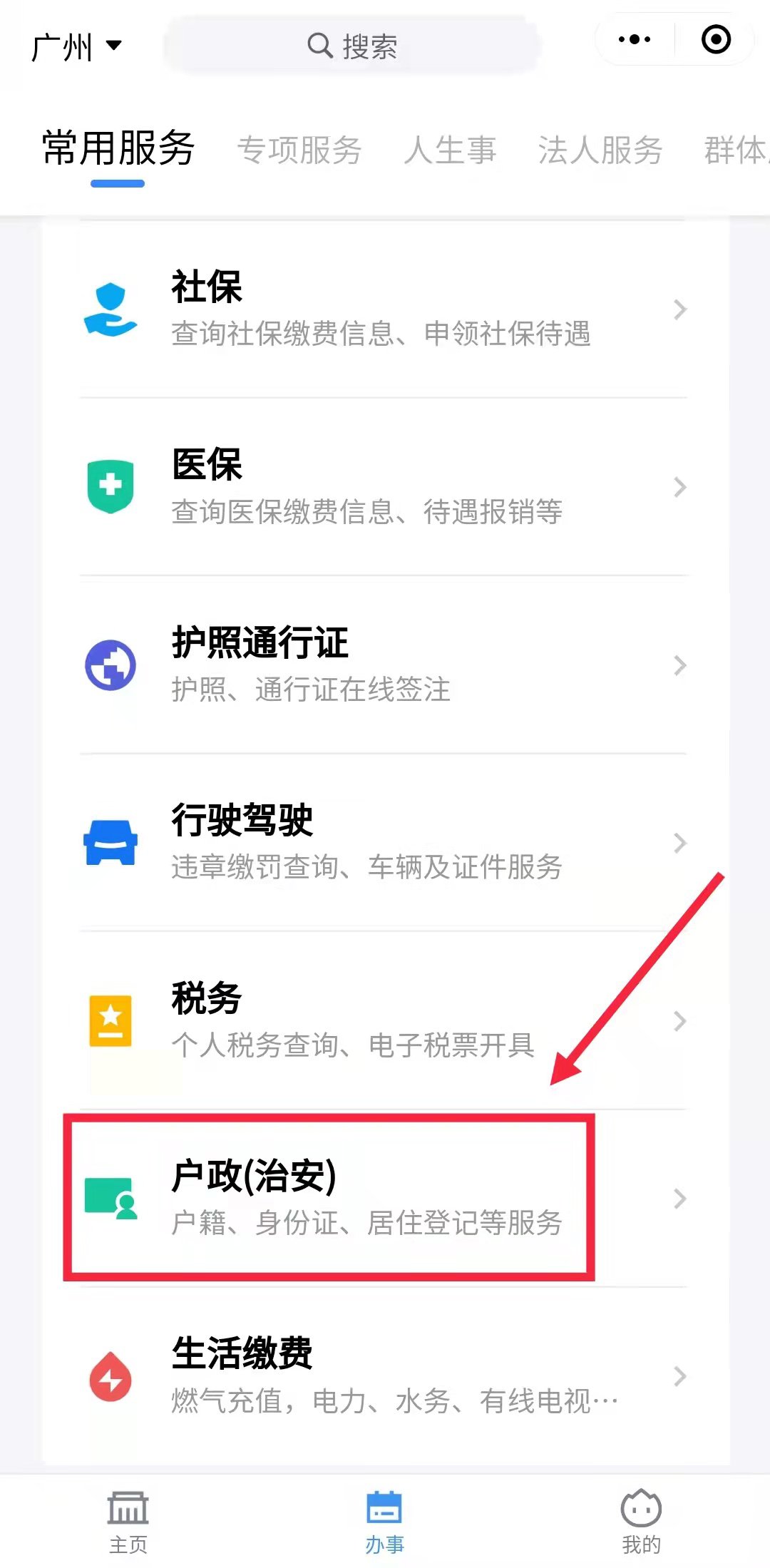第二步:在【办事】版块中,找到【户政(治安)】,如下图所示: