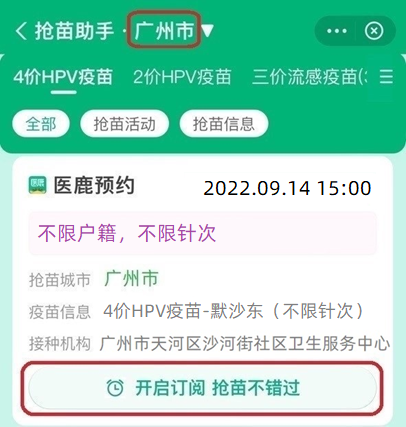 天河区沙河街二价四价hpv疫苗预约接种指南(9月14日)