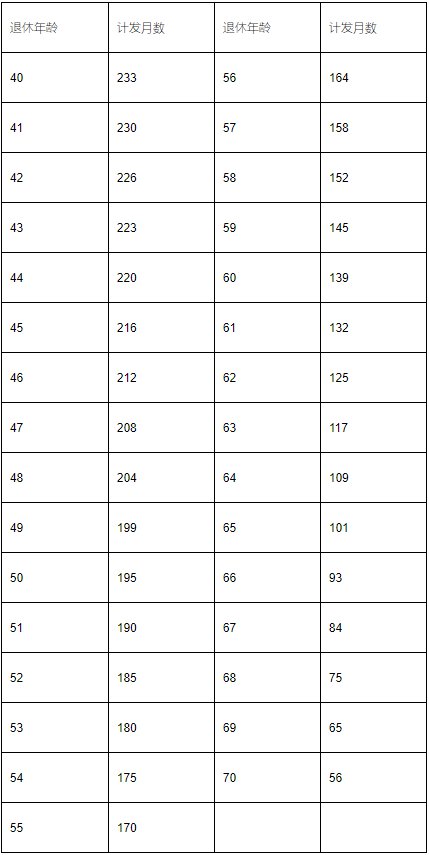 (二)个人账户养老金计发标准为个人账户储存额除以计发月数。个人账户储存额由个人缴费、参保缴费补贴、集体补助以及其他来源的缴费资助组成,计发月数与职保个人账户养老金计发月数相同(详见下表)。