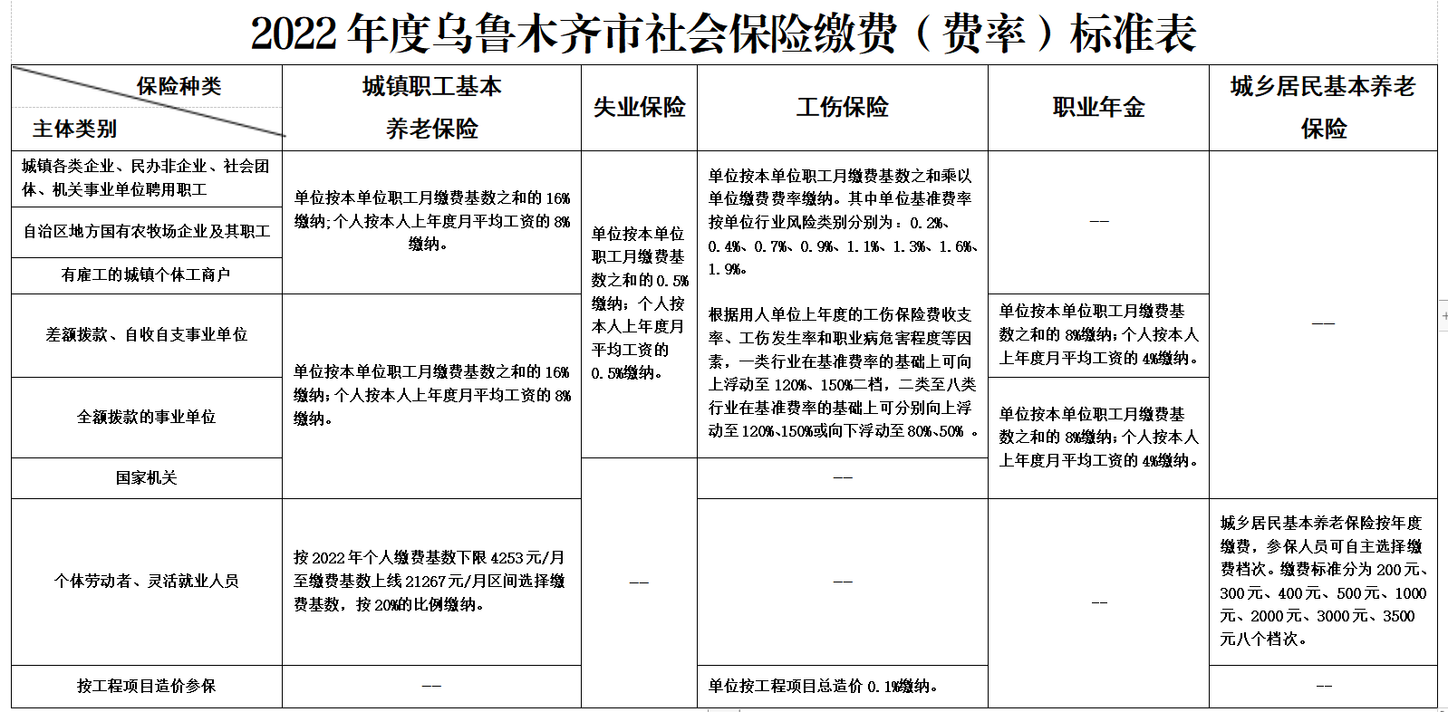 2022年乌鲁木齐社会保险缴费基数+缴费费率